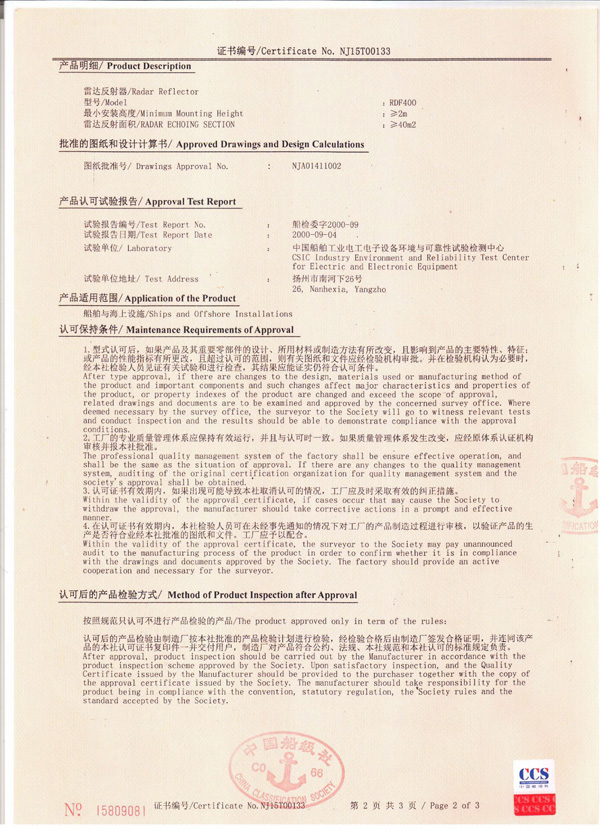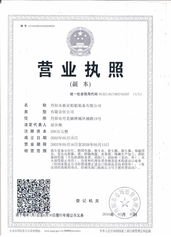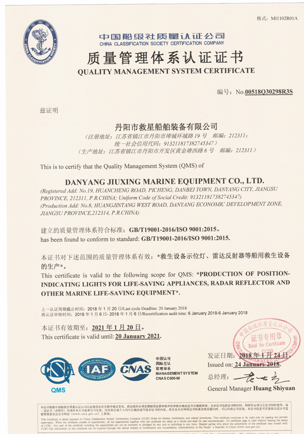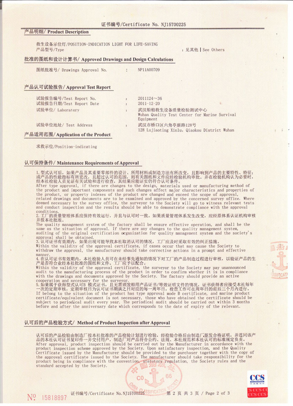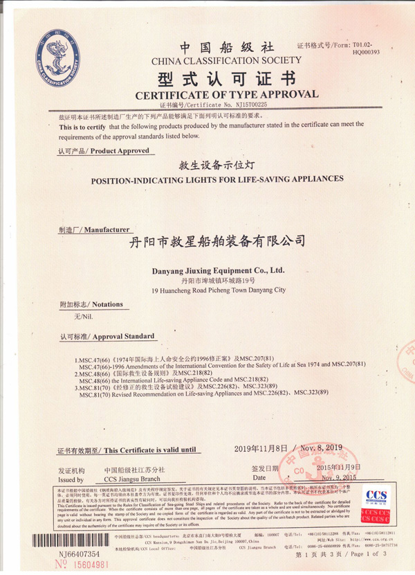 丹陽市救星船舶裝備有限公司為丹陽市船舶救生照明設備廠子公司,主要生產救生設備示位燈、雷達反射器、引航員軟梯、登乘梯等產品。其中救生設備示位燈采用國際上最先進的科學技術、生產工藝,優質材料制造,各項技術指標超過國際先進水平,完全滿足國際最新標準。2012年元月取得“CCS”型式認可證書,并具有歐共體“EC”證書。另外本公司制造的RDF400雷達反射器還獲得了實用新型專利。